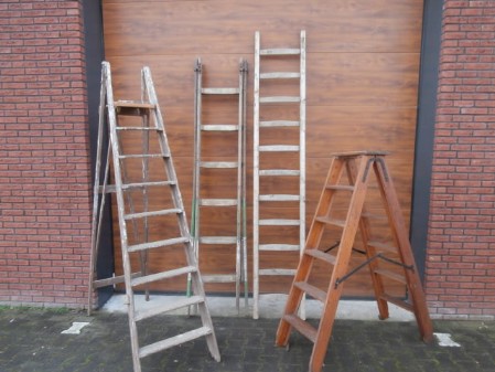 Uitgebreid aanbod van houten ladders en trappen voor decoratie verhuur